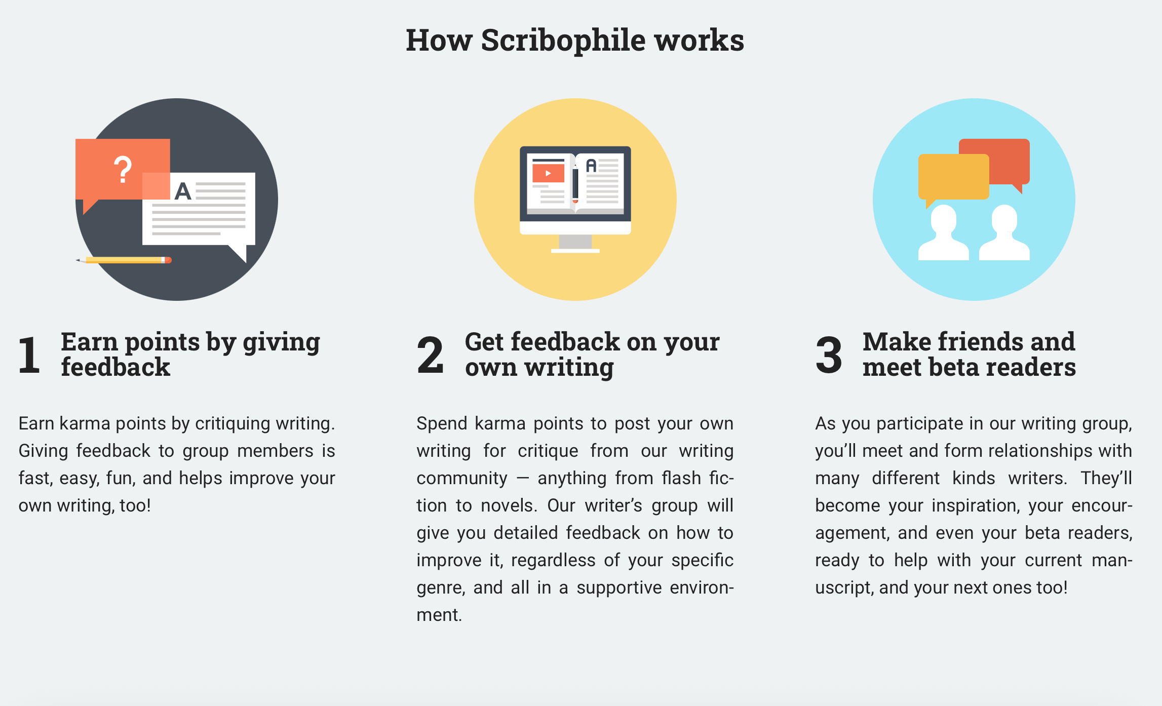 When leaving a critique, you will read the following: “Critiques at Scribophile are required to be mostly constructive criticism — that is, actionable ways for the author to improve. Critiques are not rewriting the author’s work for them, but rather they’re using your words to tell the author how to improve on their own.”